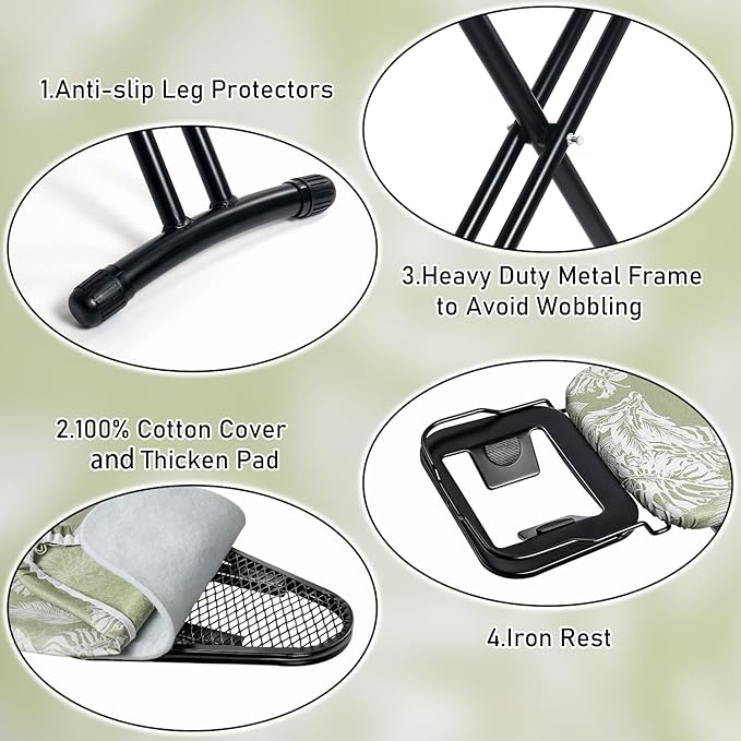 - Extra Cover Felt Padding:Comes with a 100% cotton material heat resistant washable cover(elastic cord design on the edge)and 10 mm felt padding not the inferior foam pad, thick enough, will not mark your clothes, to keep a good ironing experience