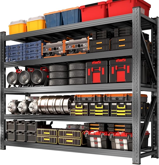 - 【Spacious and Multifunctional】 These garage shelves are 24"D x 63"W x 71"H, so they have plenty of space for all your bits and bobs. The metal shelving units is a useful piece of furniture that can be used in many different places, such as the garage, gym, kitchen, warehouse, living room, bedroom, basement or workplace.