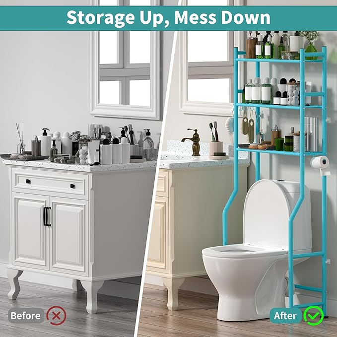 - CONSTRUCTIONAL STABILITY - With 3 open shelves, this above toilet storage rack provides plenty of space to store towels, toilet paper, toiletries and more. The included 4 no-punch anti-tip kits and 4 height-adjustable feet prevent the shelf from swaying and tipping, thus improving the overall stability of the bathroom shelf.