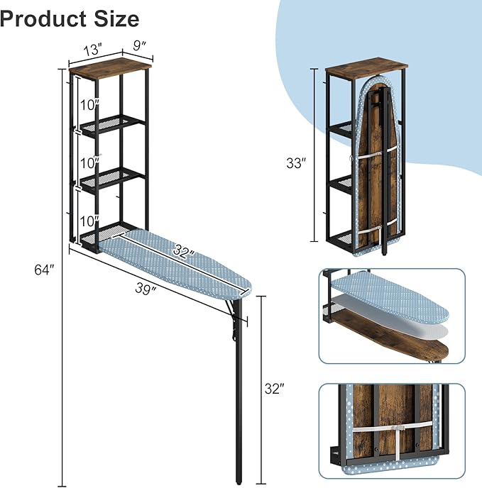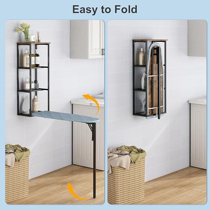 GILLAS Wall-Mounted Iron Board with 3 Storage, Ironing Board Full Size, Tabletop Ironing Stand, Iron Table for Home, Apartment, Rustic Brown