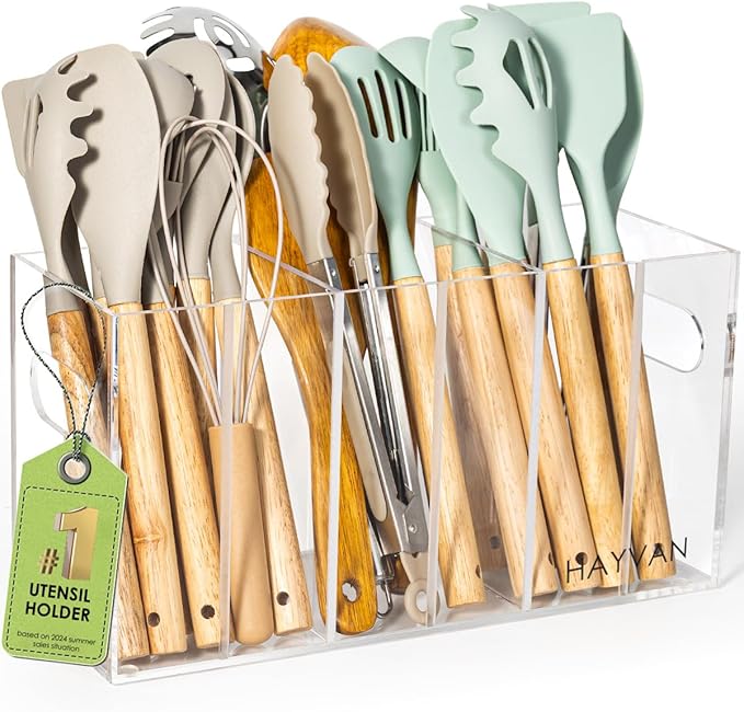 HAYVAN Clear Acrylic Utensil Holder for Kitchen Counter - Space-saving Organizer with 3 Adjustable Dividers - Easy to Use & Clean, Utensil Caddy for Kitchen Storage & Decor