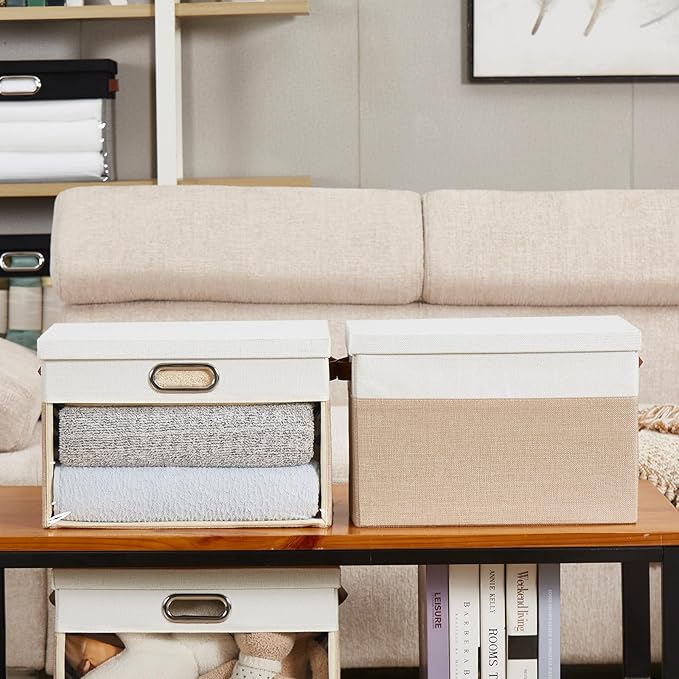 - Excellent Quality: Clear window storage bin is made of high quality linen, soft, breathable and odorless. PVC clear window—no more rummaging through stacks to find what you need! In addition the storage organizer is paired with reinforced thick cardboard, not easy to tear and deform, durable, for your long-term storage needs. The storage basket with lid protects against dust, keeping your items neat and clean.