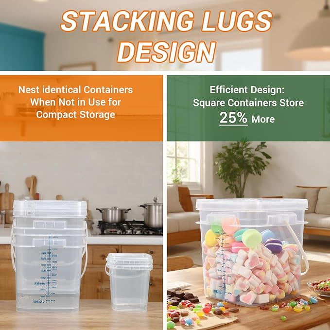- Space-Saving Stackable Design:The square shape allows seamless stacking as a fridge organizer or pantry solution, maximizing shelf space. Flat surfaces and secure lids prevent dust and leaks, while sturdy handles enable easy transport. Unlike bulky buckets, their sleek design fits the aesthetic of modern kitchens or office storage.