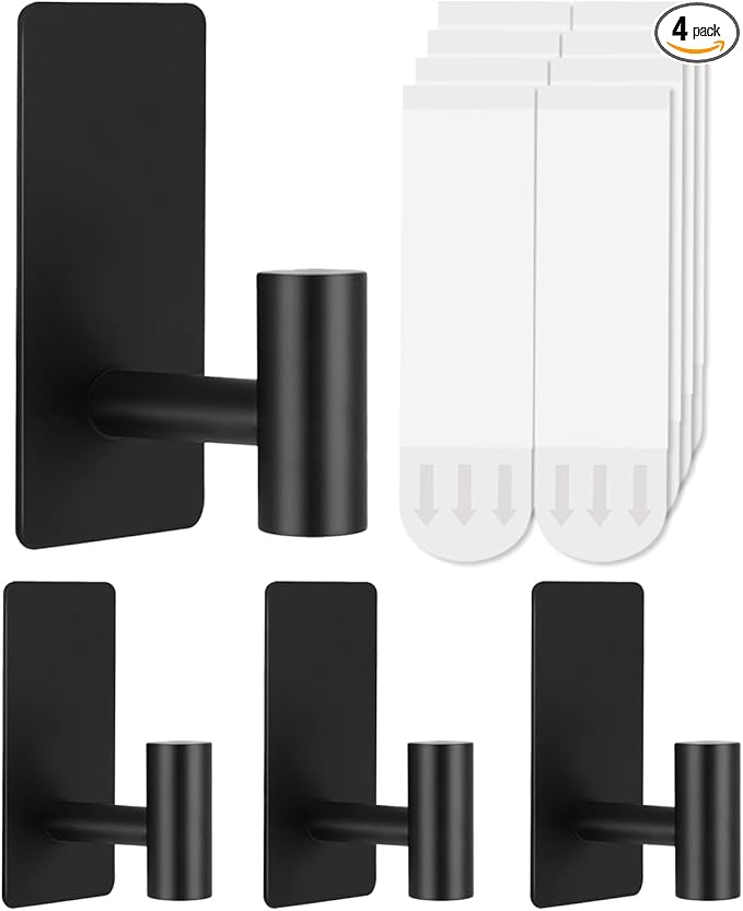 4 Pcs Towel Hooks Heavy Duty for Hanging,Adhesive Wall Hooks with Removable Strips,Sticky No Damage,Outdoor for Bathrooms,Shower,Stockings,Decor,Robe,Large,Black 304 Stainless Steel