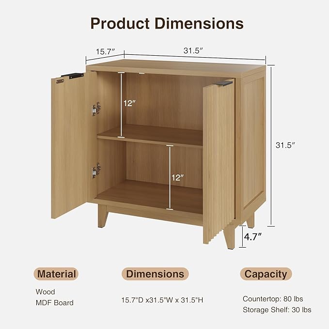 - Large Space with Adjustable Shelves: This sideboard cabinet provides ample storage space to help organize and create a tidy environment. The overall dimension: 31.5" W x 15.7" D x 31.5" H. The accent cabinet built-in divider shelves that can be adjusted in 3 heights, each with a 2" difference. Freedom to adapt to the height of the items you need to store to maximize storage efficiency