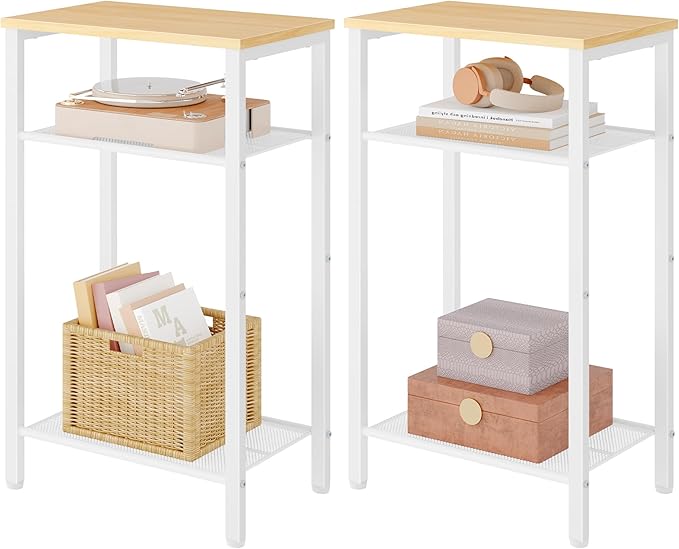 Hoctieon 2-Set 3 Tier End Table, Telephone Table Set of 2, Tall Side Table with Storage Set of 2, Small Nightstand for Small Spaces, Metal Frame, White and Yellow Oak