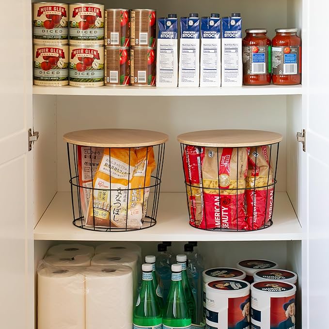 IRIS USA Round Wire Basket with Wooden Lid, 2 Pack, Potato Onion Vegetable Storage, Nestable Storage Bins, Water Resistant Surface, Living Room Bathroom Kitchen, Durable Easy Assembly Space Saving
