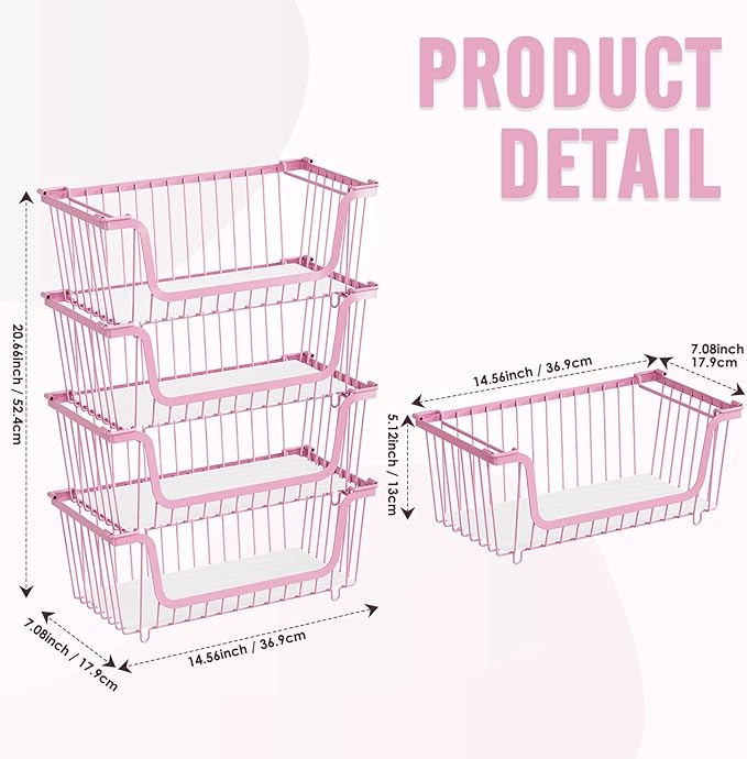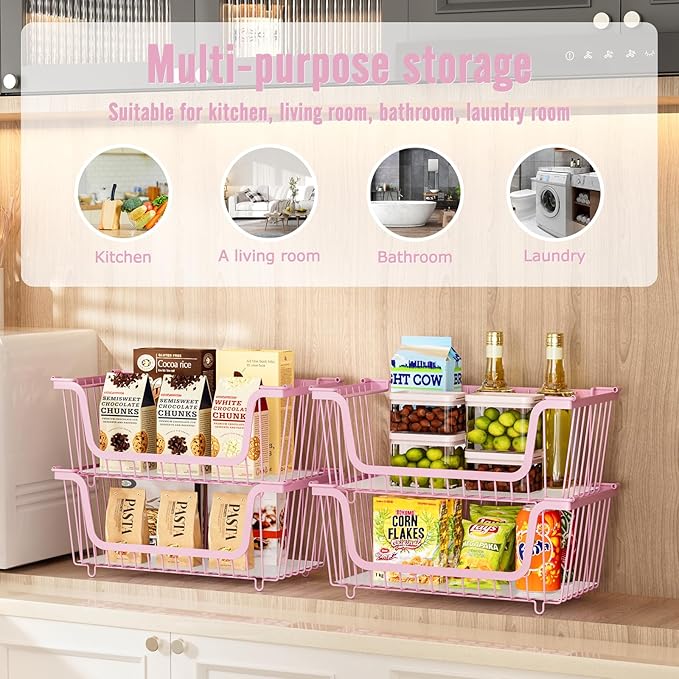 4 Pcs Stackable Wire Baskets for Pantry Organizers and Storage,Vegetable Fruit Basket for Countertop,Kitchen Storage Metal Baskets,Produce Potato Onion Storage Bin,pink