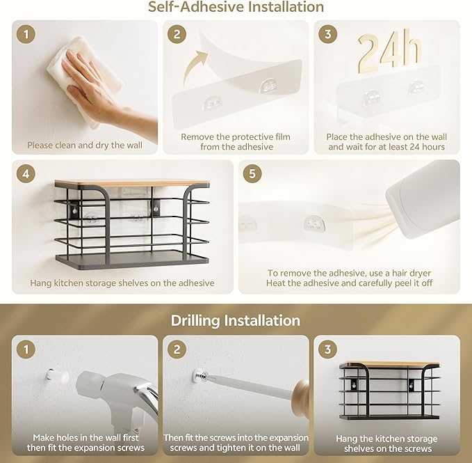 - Easy to Use: Three setups—stack on countertops, self-adhesive install, or drill-mount. For self-adhesive strips, wait 24 hours before use. Alternatively, use provided drilling accessories. Ideal for all your pantry storage needs