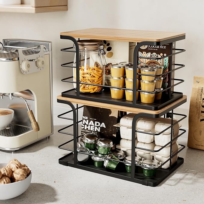 - Stackable 2 Pack Pantry Organizers Set: Crafted from natural bamboo & stainless steel, waterproof, rust-proof, sturdy & stylish. Large front openings + hollow-out design let you easily view and access stored items. Ideal for pantry organizers and storage needs