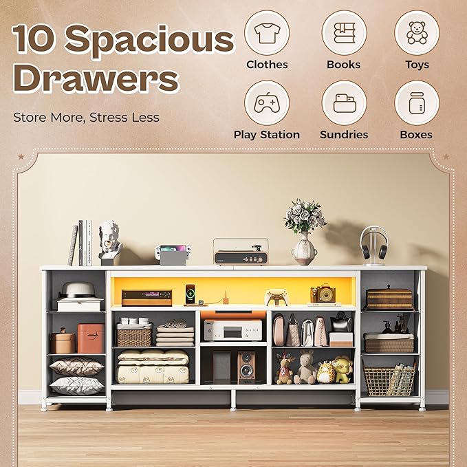 - 【10 Drawer Dresser with Storage】Featuring 10 drawers in 2 sizes, this led dresser for bedroom has a stunning storage, allowing you to neatly organize and store your media devices, DVDs, gaming consoles, books, other accessories. The drawers are great for additional, out of sight storage. You can also store your items on the shelves in the middle