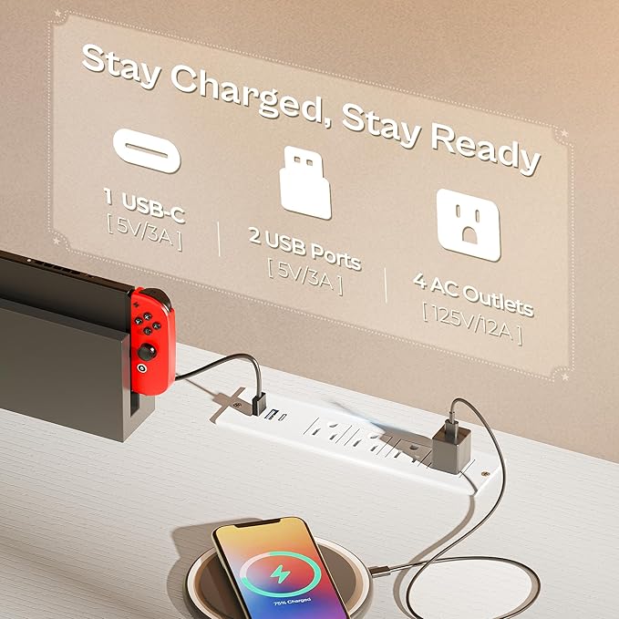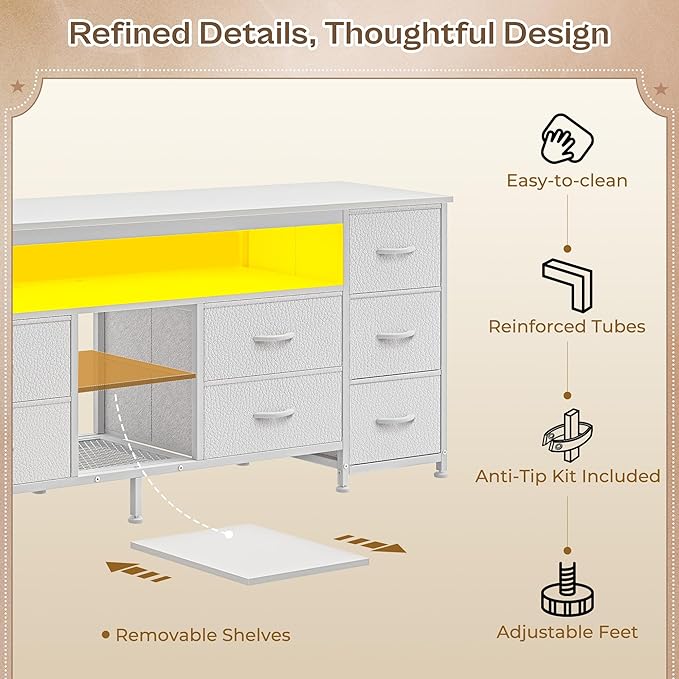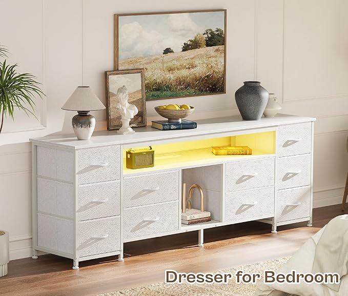 - 【LED TV Stand with Power Outlets】With 4 AC outlets, 2 USB ports, and a USB-C port, your TV, soundbar, and gaming gear are always charged and ready. Want to set the mood? The built-in LED lights on the bedroom dresser bring your room to life, choose from over 60,000 colors, sync with your music, or schedule lighting scenes via app. Perfect for gamers who want immersive RGB lighting