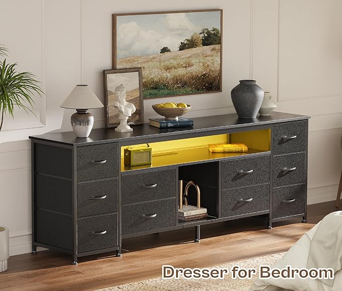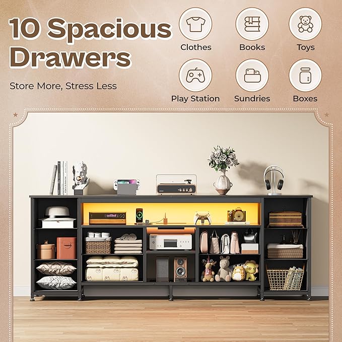 - 【10 Drawer Dresser with Storage】Featuring 10 drawers in 2 sizes, this led dresser for bedroom has a stunning storage, allowing you to neatly organize and store your media devices, DVDs, gaming consoles, books, other accessories. The drawers are great for additional, out of sight storage. You can also store your items on the shelves in the middle