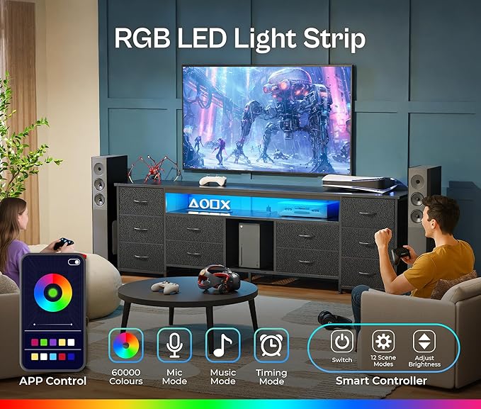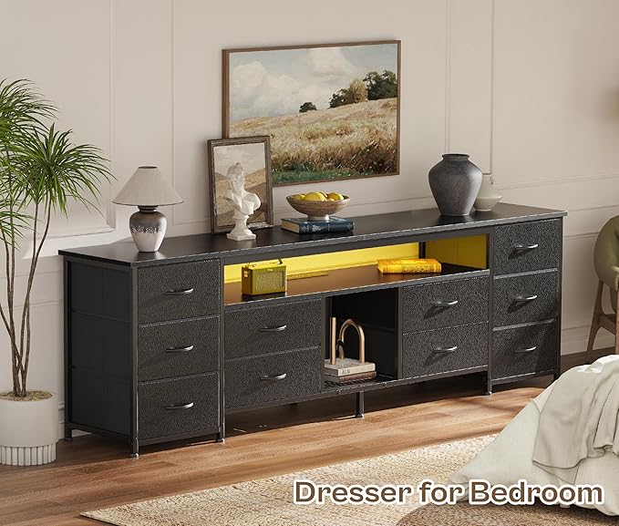 - 【LED TV Stand with Power Outlets】With 4 AC outlets, 2 USB ports, and a USB-C port, your TV, soundbar, and gaming gear are always charged and ready. Want to set the mood? The built-in LED lights on the bedroom dresser bring your room to life, choose from over 60,000 colors, sync with your music, or schedule lighting scenes via app. Perfect for gamers who want immersive RGB lighting