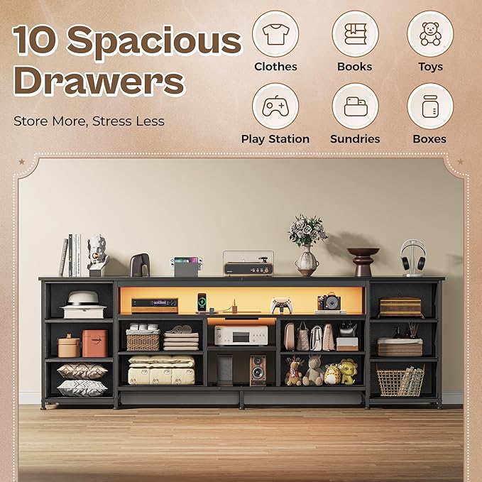 - 【10 Drawer Dresser with Storage】Featuring 10 drawers in 2 sizes, this led dresser for bedroom has a stunning storage, allowing you to neatly organize and store your media devices, DVDs, gaming consoles, books, other accessories. The drawers are great for additional, out of sight storage. You can also store your items on the shelves in the middle