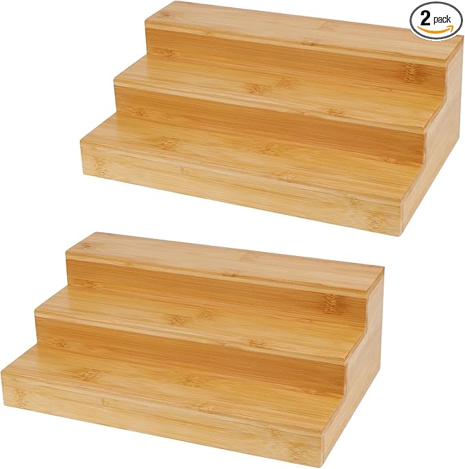 2 Pack Bamboo Spice Rack Organizer for Countertop, 3 Tier Spice Step Shelf for Cabinet (Jars Not Included)