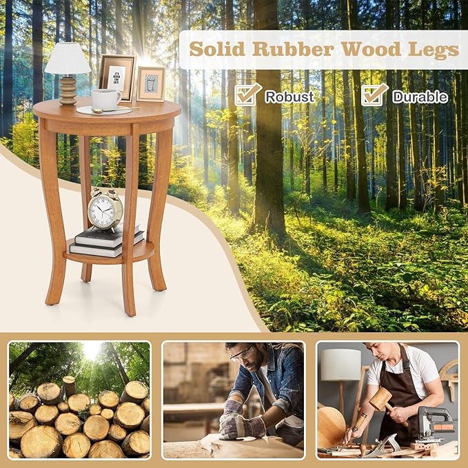 Giantex Round End Table Set of 2, Retro Nightstand with Storage Shelf & Solid Wood Legs, 24.5" Accent Side Table for Small Spaces, Wood Night Stand for Living Room Bedroom, Light Brown