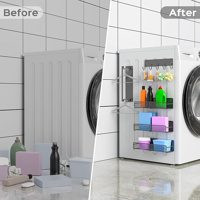 - Laundry Room Organizer for Washer & Dryer: Tame laundry room mess with this magnetic shelf for washer and dryer! Store detergent bottles, dryer sheets, and fabric softener on the shelves, while the towel hanger keeps cleaning towels or hand towels neatly hung. Essential for small laundry room organization and storage.