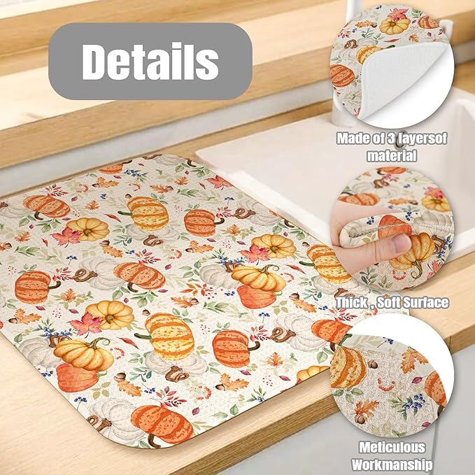 Dish Drying Mat for Kitchen Counter Large 18" x 24" Fall Pumpkin Absorbent Microfiber Dishes Drainer Rack Mats Pad Reusable Washable