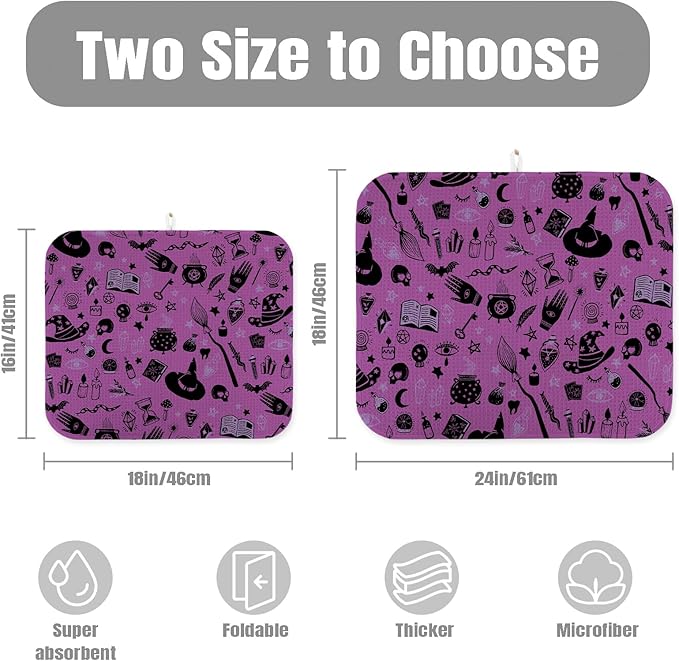 Dish Drying Mat for Kitchen Counter Large 16" x 18" Purple Halloween Witch Absorbent Microfiber Dishes Drainer Rack Mats Pad Reusable Washable