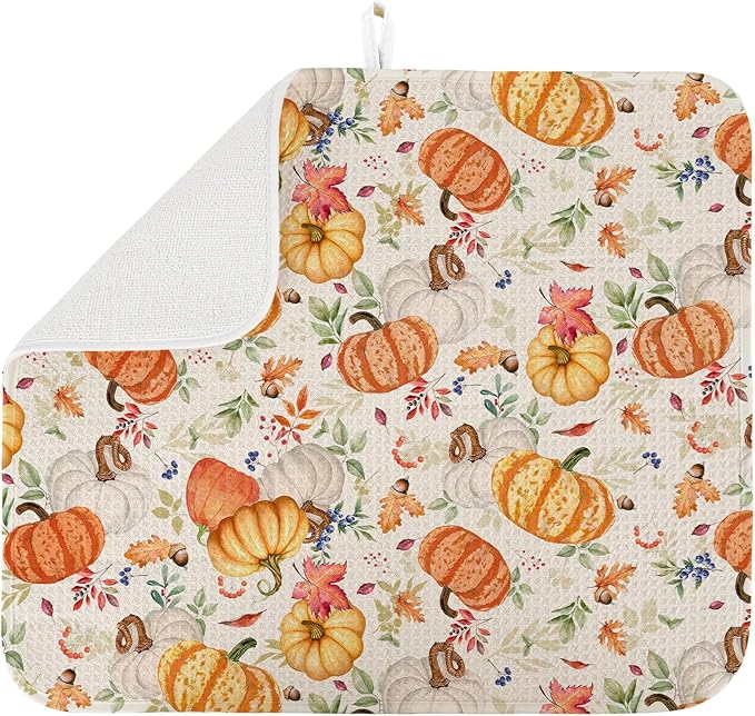 Dish Drying Mat for Kitchen Counter Large 16" x 18" Fall Pumpkin Absorbent Microfiber Dishes Drainer Rack Mats Pad Reusable Washable