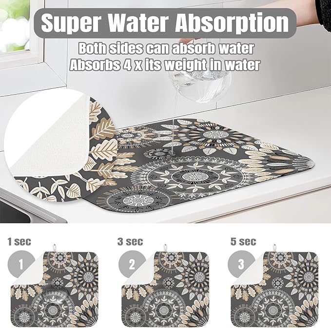 Dish Drying Mat for Kitchen Counter Large 16" x 18" Mandala Absorbent Microfiber Dishes Drainer Rack Mats Pad Reusable Washable