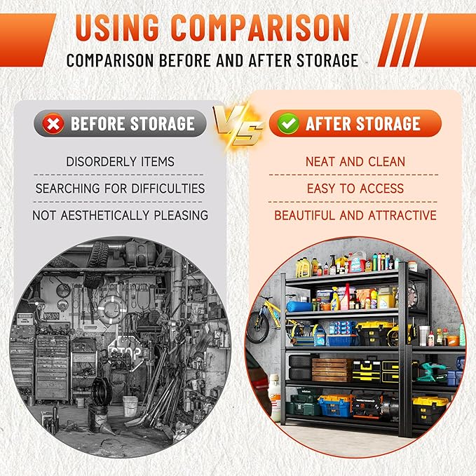 - 【Easy to assemble, can be completed in 10 minutes】This garage shelf is equipped with detailed instructions and tools, and the modular design allows you to quickly build and enjoy clean and orderly storage space immediately. The installation process is simple and fast, and one person can easily complete the assembly without complicated tools. Even if you are not a DIY expert, you can assemble it quickly. All-metal design will be a good helper for your garage and family after assembly.