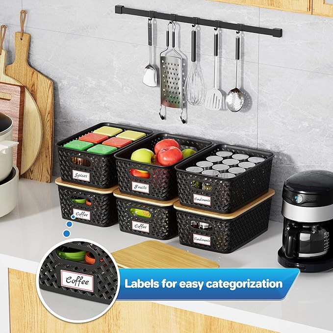 8 Packs Plastic Storage Bins with Bamboo Lids - Stackable Storage Bins Decorative Small Basket Containers for Organizing Shelves Office Classroom Desktop Closet, Black