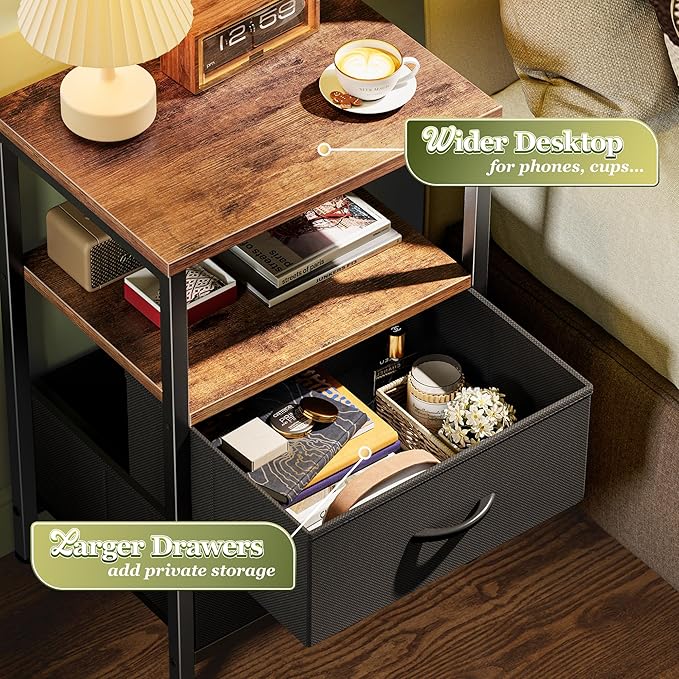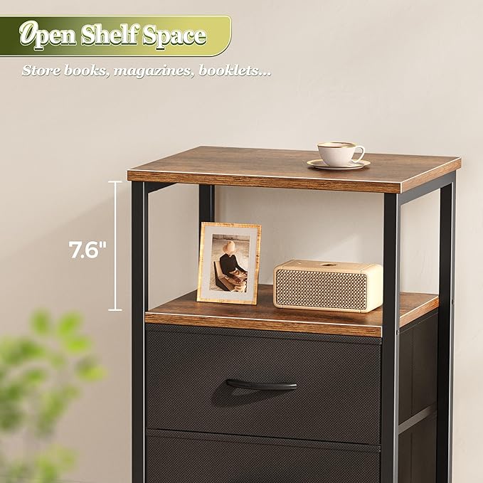 - 【Nightstand with 2 Drawers】2 spacious fabric drawers and an open shelf help you organize nighttime essentials, books, glasses, remotes, and more, all within easy reach. Enjoy a cleaner, calmer space with this bedside table