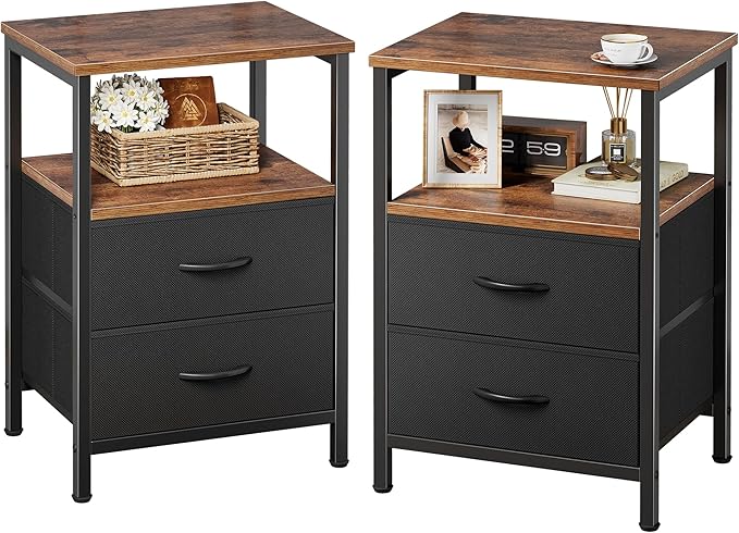 Huuger Night Stand Set of 2, Nightstand with 2 Drawers, Bed Side Table with Open Shelf, Wooden Top, End Table, Fabric Drawer, for Bedroom, Rustic Brown and Black