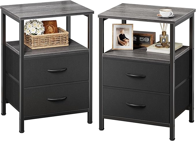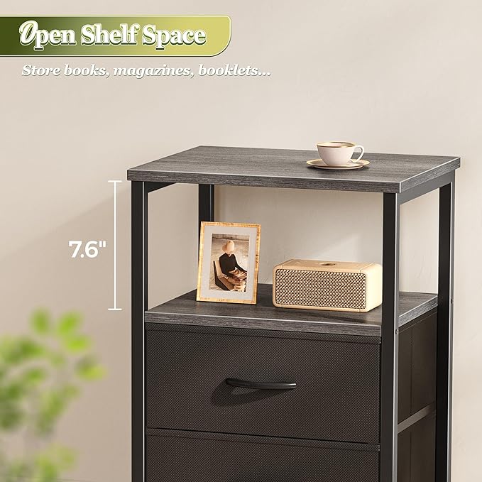 - 【Nightstand with 2 Drawers】2 spacious fabric drawers and an open shelf help you organize nighttime essentials, books, glasses, remotes, and more, all within easy reach. Enjoy a cleaner, calmer space with this bedside table