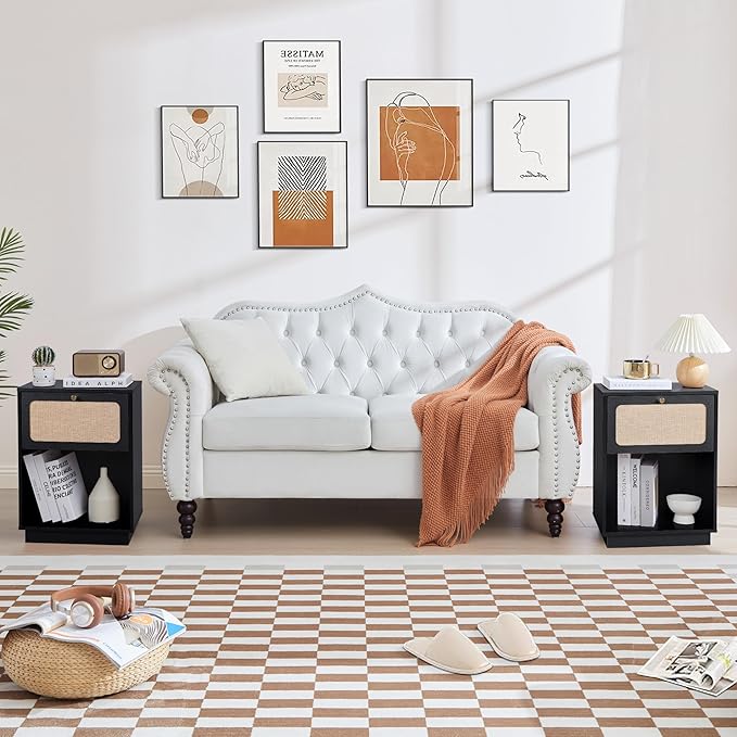 - Function-wise: The end table with a linen rattan decor drawer both as a shelf or storage space and as an added décor to the room, you can place small things like books, cups, and remote controls on top of it.You can also place two or more night stand with drawers side by side as a side table, refreshment table, Mini bar table, Toiletries storage etc.
