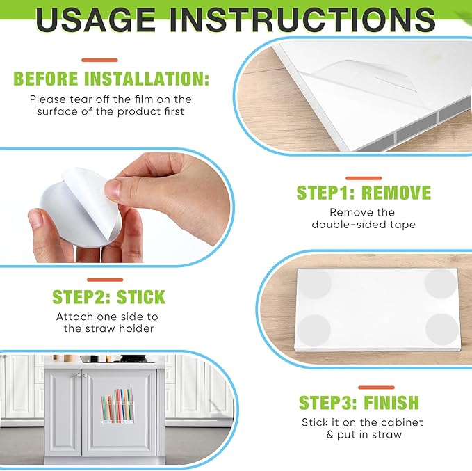 - Complete Package for Easy Installation: the package includes 1 acrylic straw holder and 4 pieces of double sided adhesive tapes (straw not include); The tapes provide a secure and stable setup, ensuring the straw holder stay securely even in busy areas; The outer layer of the product has a plastic film and auxiliary tape; The plastic film needs to be torn off before use; The tape is applied to assist in fixing the product and can also be torn off without affecting the stability of the product