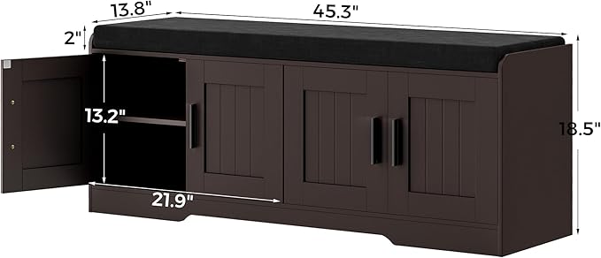 2-Tier Storage Bench, Shoe Bench with Thickened Padded Seat Cushion, Entryway Bench with 4 Doors, Adjustable Shelf, 13.8" D x 45.3" W x 18.5" H, for Entryway, Living Room, Bedroom, Brown