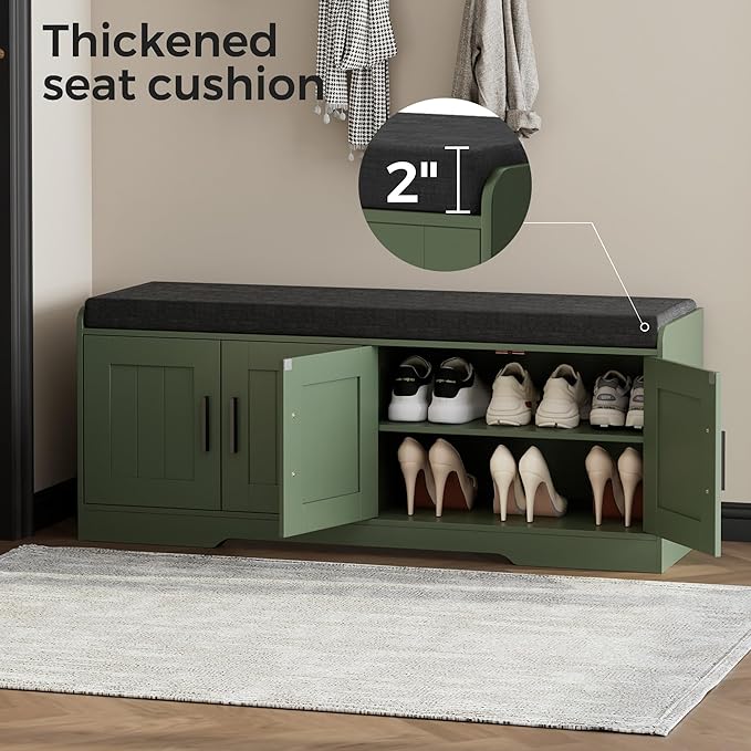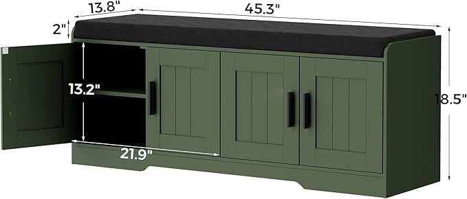 2-Tier Storage Bench, Shoe Bench with Thickened Padded Seat Cushion, Entryway Bench with 4 Doors, Adjustable Shelf, 13.8" D x 45.3" W x 18.5" H, for Entryway, Living Room, Bedroom, Green
