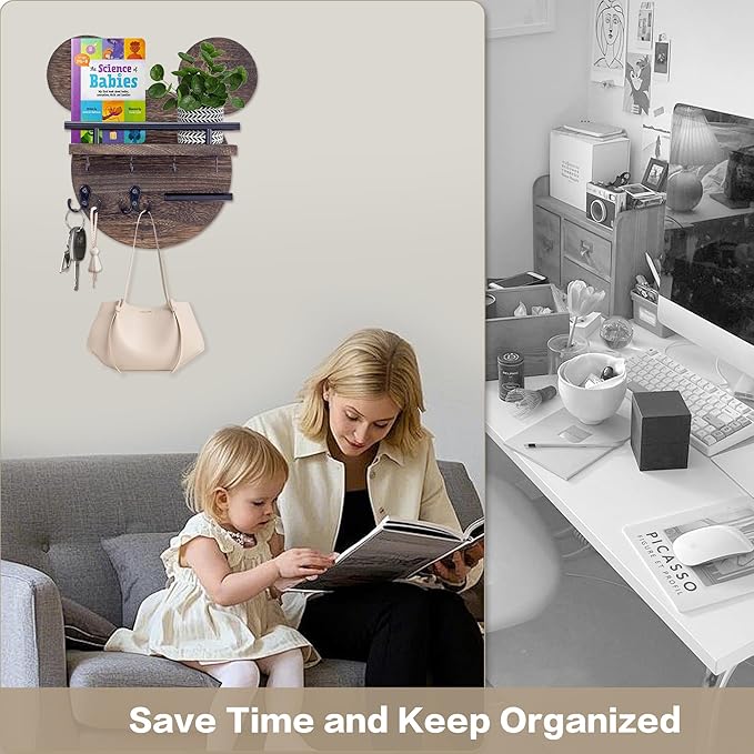 AIRPOP Disn Key Holder for Wall–Mouse Wooden Mail Organizer Wall Mount with Shelf and 6 Hooks, Easy Installation Key Rack Hanger for Entryway Living Room Home Decor (Brown)