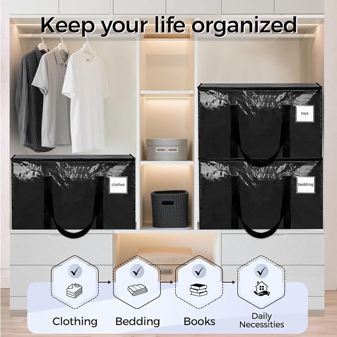 16 Pack Extra Large Heavy Duty Moving Bags, Black Storage Bins with Lids, Reinforced Handles & Heavy-Duty Zippers Moving Boxes Storage Bags Totes for Clothes Packing, Dorms, College Supplies, Black
