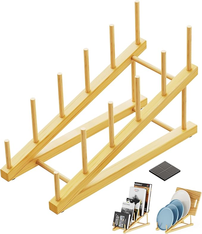 - All-in-One Kitchen Storage: Works as a plate organizer for cabinet, cutting board holder, and utensil dryer. Holds plates, bowls, cups, books and baby bottle drying rack needs.