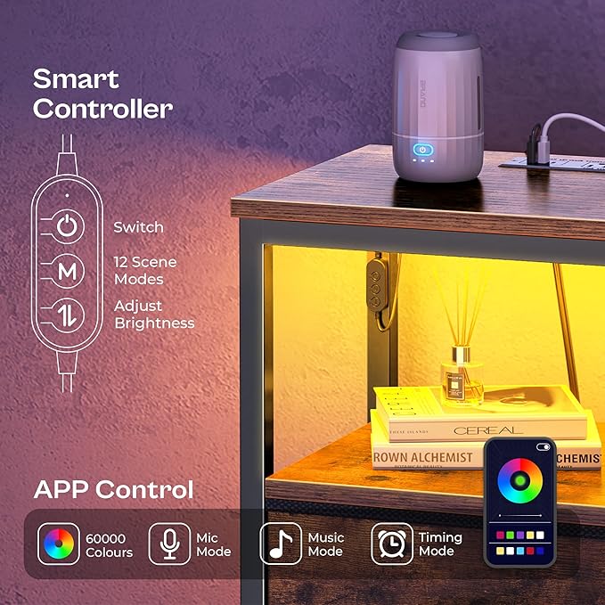- 【Nightlight or for Room Ambiance】With a smart controller, choose from 12 scene modes, 5 adjustable speed levels, and 3 brightness settings or smartphone app with over 60,000 colors, set timers, music and mic mode. Whether you need a gentle nightlight or want to create the perfect mood, this LED nightstand’s LED lights offer versatile lighting options that give room just the right amount of light to sleep with