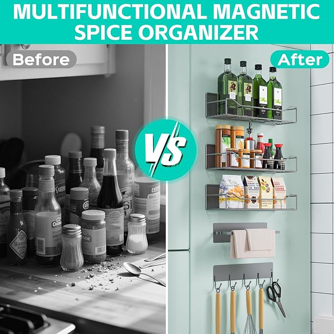 - ✅【Space-Saving Powerhouse】Instantly unlock wasted vertical space with our 5 pack magnetic shelves! Secured by powerful magnets, it transforms the side of your washer or fridge into a clutter-free zone for detergents, and Kitchen supplies—no drilling or bulky cabinets needed. Organize smarter, not harder.