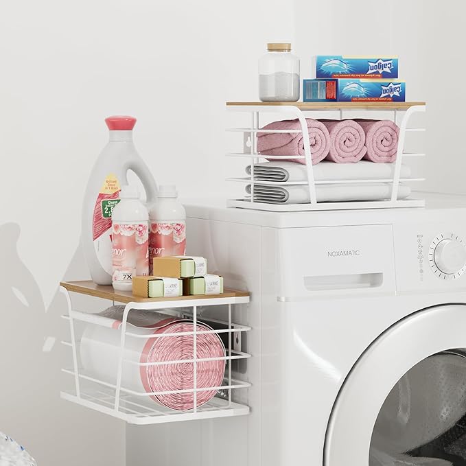 Extra Large 2 Pack Stackable Pantry Organizers - Laundry Room Organization & Decor, Kitchen Decor, Wall Mount Trash Bag Holder with Bamboo Top, White