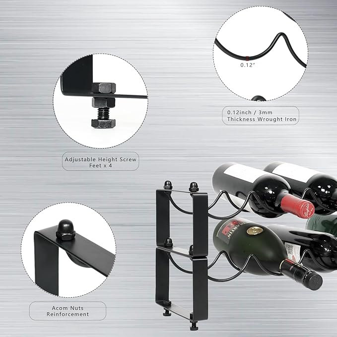 - 【CONSTRUCTED TO LAST】 Made from 0.12 inch thick high-quality iron, this durable wine bottle holder is built to last. The freestanding design is powder coated for a beautiful look and is less likely to bend, scratch, or fade
