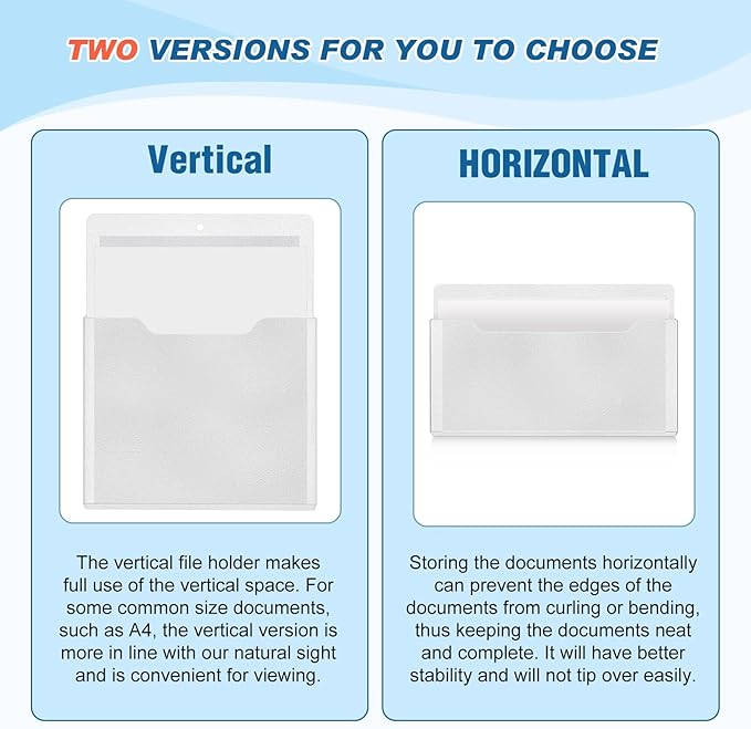 - Easy to Use: the magnetic file holder for refrigerator is designed with magnets on the back, which make the file holder stick to most smooth and flat metal surfaces, such as filing cabinets, refrigerators, lockers, whiteboards and so on; Besides, there is a round hole at the top, so you can hang them on the wall and many other places, they can hold up to 2.2lb