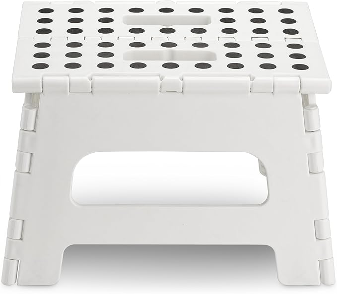 - SPACE-SAVING DESIGN: Easy to fold and slim enough to fit in tight spaces, the folding stool is perfect for small apartments or cluttered homes. Store it in a drawer, between appliances, or even under the bed