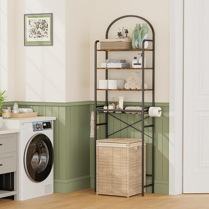 Homhedy 4-Tier Over The Toilet Storage with 4 Hooks and Paper Holder, Space Saving, Bathroom Organizer with Adjustable Feet, Metal Frame and Wooden Shelf,Rustic Brown and Black
