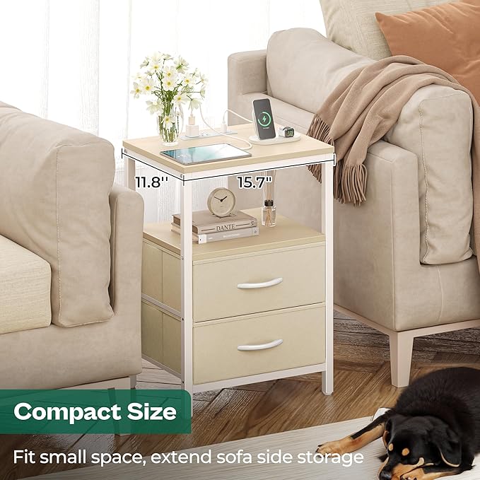 Huuger Nightstand with Charging Station, Side Table with Fabric Drawers, End Table with Open Shelf, Bedside Table with USB Ports and Outlets, Night Stand for Bedroom, White Marple