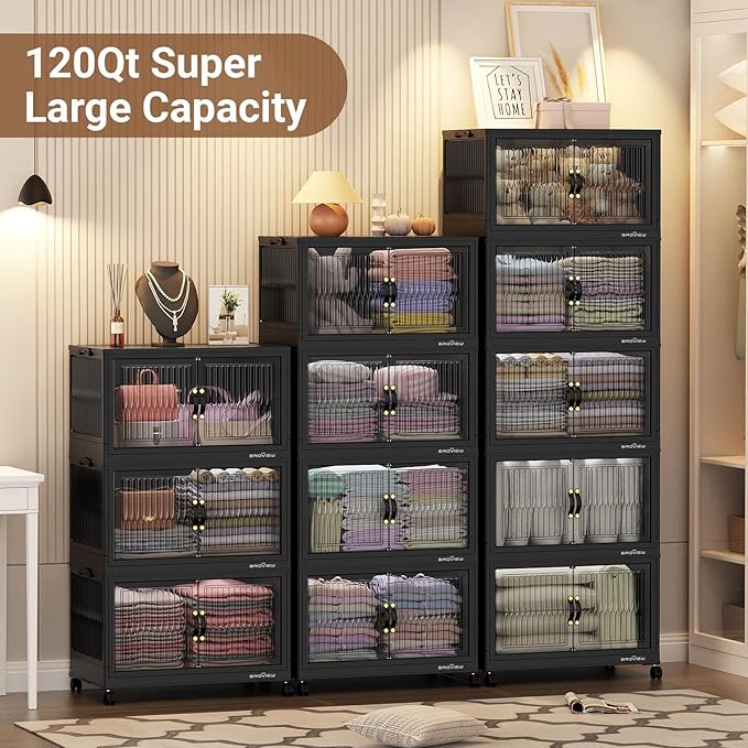 480Qt Stackable Storage Bins with 4 Lids, Extra Large Closet Organizer Collapsible Drawer Boxes with Wheels, Folding Plastic Cabinet Containers for Home Kitchen Room Organization, 4Pack Black