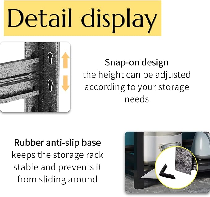 - 【Long-lasting Use】This steel storage rack uses anti-rust spray paint technology, making it easy to clean, moisture-resistant, and rust-proof. Two umbrella ribs are placed beneath each metal shelf, ensuring stability regardless of the load (even when empty). This metal shelf can serve you for years to come.