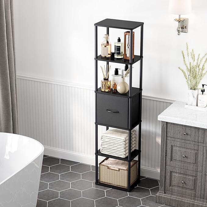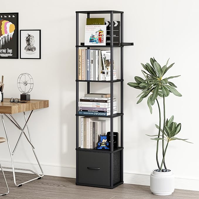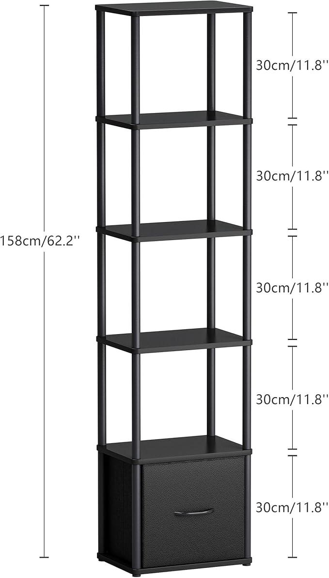 6-Tier Bookshelf with Drawer, Narrow Bookshelves Organizer, Floor Standing Ladder Shelf, Tall Bookcase for Small Space, Book shelf with Storage for Living Room, Bedroom, Office, Study Black HBC505B