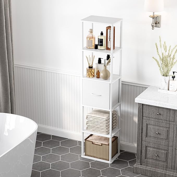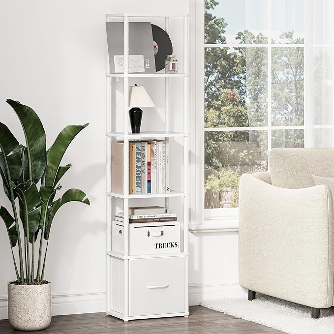 6-Tier Bookshelf with Drawer,Narrow Bookshelves Organizer,Floor Standing Ladder Shelf,Tall Bookcase for Small Space,Book shelf with Storage for Living Room, Bedroom, Office, Study White HBC505W